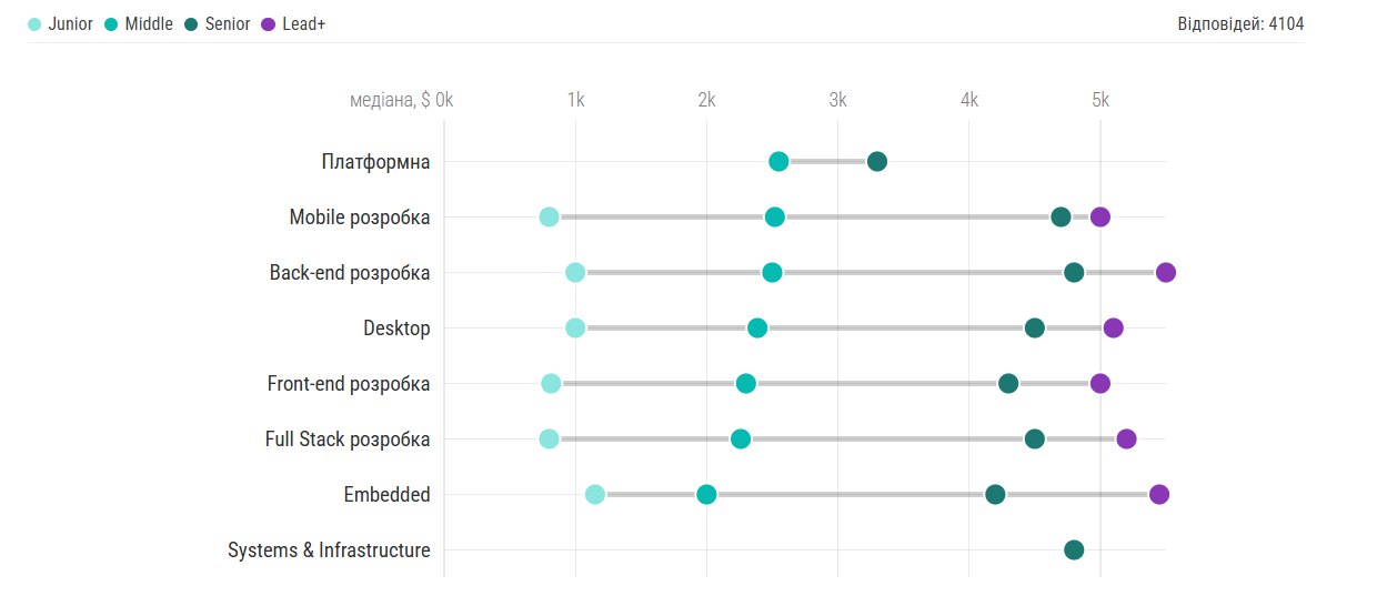 - Продуктові компанії платять стабільно добре, особливо на senior/lead-рівнях, і компенсують це додатковими стимулами.