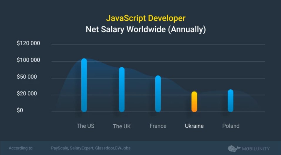 Натомість зарплати початківців (junior JavaScript developers) залишаються доволі стабільними на ринку.